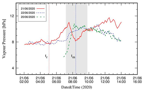 In this comparison of VP at Riyadh during the partial solar eclipse on 21 June 2020 (07:10–09:49) and the day after (22 June 2020; blue short, dashed line) at the same interval, the effect of the eclipse is seen (red solid line). Sunrise and maximum time are shown as vertical dotted lines, while shaded area refers to the eclipse phase. From a certain point (at 08:20.5) onwards it produced an expected increase of VP until 08:41.5, very close to the final phase of the eclipse. A third curve (in green dashed line), corresponding to the day before the eclipse (20 June, from ~06:50 to 14:00), has been included to confirm such an effect.