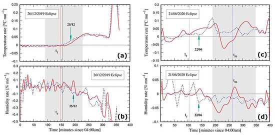 Temporal evolution of the computed rates of temperature and RH for the Al-Hofuf eclipse [panels (a,b)] and for the Riyadh eclipse [panels (c,d)]. For both eclipses, the computed rates for non-eclipse days are also reported (blue short-dashed blue curves). In panels (a,b), the vertical dotted line indicates the sunrise time (tr), the shaded area refers to the solar eclipse phase, while the shaded area between vertical lines indicates the short phase of the annularity. In panels (c,d), sunrise and maximum time are shown as vertical dotted lines, while shaded area refers to the eclipse phase. Horizontal dotted lines indicate zero-rate level. The curves have been smoothed using the “moving-average” technique for a better curve evolution visualization.