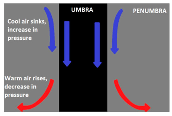 In the central area of the eclipse there is a distinct minimum of vapor pressure coinciding closely with the rise of pressure, which is nearly coincident with totality and with the time of maximum cooling of the air away from the Earth’s surface; this indicates that there is a descent of drier air from aloft to supply the outflowing current as it is illustrated in this figure. It is possible, then, that this produces some adiabatic warming at the surface, partly mitigating at least the decrease in temperature due to the loss of radiative heating. Yet, presumably, the radiative effect dominates. The arrows indicate the air flows (blue for cool and red for warm).