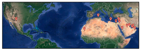 Riyadh (24.86° N; 46.40° E, 764 m asl.), lying in the central region of the Arabian Peninsula, is the capital of the Kingdom of Saudi Arabia and is considered one of the most polluted cities of the Kingdom [27,28,29]. In winter, air pollution is related to falling dust, which is a frequent phenomenon between January and March [30]. Riyadh is also characterized by low humidity and large seasonal temperature differences, particularly in the summer [11% and (42.5 °C–28.0 °C), respectively]; the temperature difference is affected by the arid conditions due to proximity to the Empty-Quarter Desert. Al-Hofuf City is the major urban region in the Al-Ahsa oasis in the eastern province of Saudi Arabia, located on the center line of the 26th December eclipse path. The city is characterized by high humidity, especially during the month of December (an average of 56%).