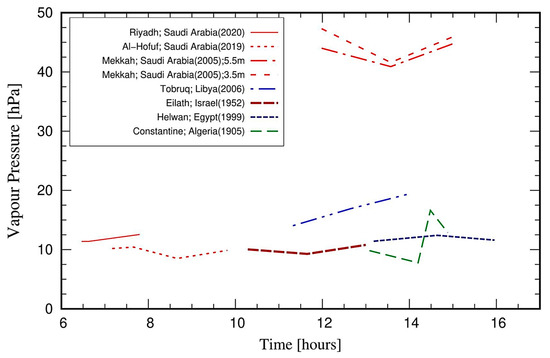 where e is actual vapor pressure and es(T) is the saturation vapor pressure at actual temperature T (in Celsius-degree) [40,41,42,43]; with a = 0.611 (kPa), b = 17.5 and c = 241 °C. The above relation stems obviously from considering the vapor pressure deficit as es(T) − e = es(T) (1 − RH). Apparently, there is no signal of influences or perturbations on VP during this eclipse at Al-Hofuf. The VP remained approximately constant over the most part of the eclipse period until 07:13 when it began to increase steadily for the rest of the measurements. Although there was a small increase in VP during the latter part of the eclipse measurement period, this was most likely not related to the eclipse. Although a statistical analysis of the typical variance in VP inferred from numerous observations would be necessary to confidently determine that these changes were insignificant, a comparison with the day before supports this finding. A similar non-effect was found by Pleijel (2008) [20] observing the late-morning TSE of 29 March 2006 at Side, Turkey, he explains that some time-eclipse effects on air humidity are reported to a much lesser extent than effects on temperature than was found by Kolarž et al. (2005) [17] during the solar eclipse of 11 August 1999 in Belgrade, Yugoslavia, and Ahrens et al. (2001) [18] observing earlier the same eclipse but in southwest Germany. In passing, Huzimara (1949) [44] observed the mid-day solar eclipse of 9 May 1948 from Mt. Huzi in Japan, at 3780 m asl., but did not detect any change in VP.
