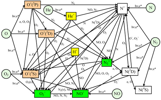 49. Torr, M.R.; Torr, D.G. Chemistry of the thermosphere and ionosphere. J. Atmos. Sol. Terr. Phys. 1979, 41, 797–839. [Google Scholar] [CrossRef]