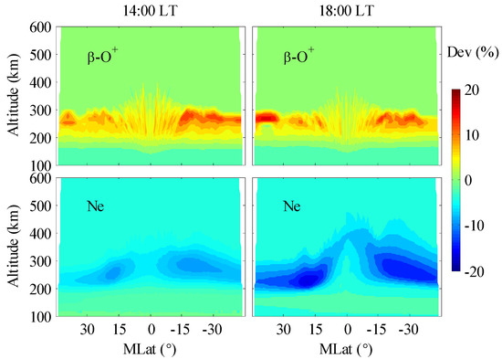 Figure 2 shows the altitude variations in the Dev. One can note that the new scheme brings a foreseeable increase in the loss rate of O+ and a decrease in the electron concentration Ne. The variation in electron concentration has the same amplitude as in the O+ loss rate (20%), and it is more pronounced at 18:00 LT. The affected height of the ionosphere is around ~200 km and the latitude is around ~20°. The altitude profiles of electron concentration are shown in Figure 3. The increase in the loss rate of O+ due to N2(ν) and O2(ν) causes an obvious decrease in F2-layer Ne. In another part of the ionosphere, the dominant ion is no longer O+, hence the electron density is almost the same. In Ref. [23], the vertical electron density profile over an equator at the geographic latitude of 5 °N was provided by SAMI2. The electron density maximizes around 500 km, while the maximum appears at about 350 km in Figure 3. This is a characteristic of the EIA, that is, the peak height of the ionosphere in the equatorial region is slightly higher.