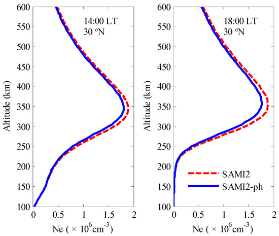 Figure 3. Altitude profiles of the modeled electron concentration at 14:00 LT and 18:00 LT at (30°N, 185°E geomagnetic). The dashed line represents the results of a model run with SAMI2, and the solid line shows the results of a model run with SAMI2ph.