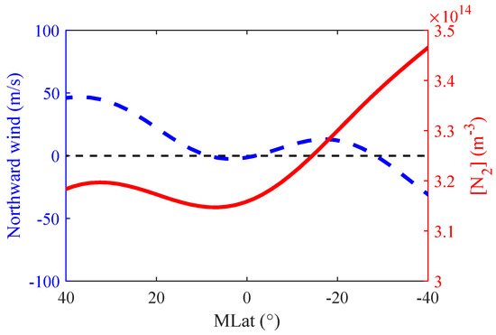 Figure 4. Latitudinal distribution of northward wind estimated from the HWM14 model at 300 km altitude (blue dotted line), and density of N2 modeled using NRLMSISE00 [35] at 300 km (red solid line) for the 185°E meridian at 14:00 LT.