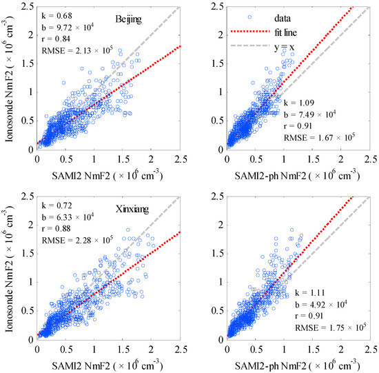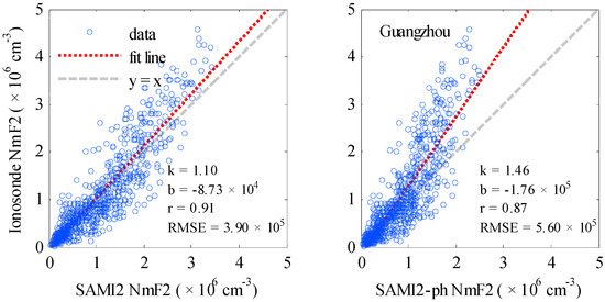 Figure 6 provides the comparison with the low-latitude ionosonde station Guangzhou (12.48 °N, 184.58 °E geomagnetic). The correlation coefficient r for SAMIph is smaller than SAMI2, and the slope k is further away from 1, which implies that the revised model severely underestimates the ionosphere at the low-latitude ionosonde station. It is well-known that the low-latitude ionosphere is strongly affected by several highly variable electrodynamic processes, producing large ranges of temporal and spatial variations in the equatorial ionization anomaly (EIA) [40]. Guangzhou is located at the northern crest of the EIA. It is not difficult to envisage that SAMIph might not perform well at low latitudes as at mid-latitudes. To improve the performance of ionosphere physical models at low latitudes, one reasonable and effective attempt should be made by seeking more accurate methods to represent the ionospheric electrodynamic processes. Hence, we can conclude that the new photochemical scheme significantly improves the performance of SAMI2 at mid-latitudes but not low latitudes.