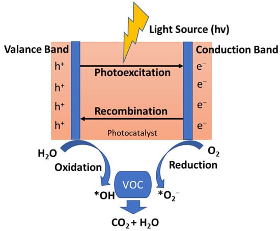 Hydroxyl radicals produced during water cleavage serve a pivotal role in the heterogeneous photocatalytic process. This setup involves exposing semi-conductive material to light while flowing airflow made of VOCs with consistent humidity through the area. The semi-conductive substance is illuminated, triggering the motion of electrons within the material. In Figure 1, a diagrammatic illustration of the photocatalytic oxidation process is given. An electron (e−) is transferred from the valence to the conduction band, while a hole (h+) is left behind when a photon with an energy of hv exceeds the energy of the band gap. The created charge carriers are instantly recombined in electrically conducting materials, such as metals. Semiconductors have partially photo-excited electron-hole pairs that move to the particle’s surface and join the chemical reaction with the donor or acceptor molecules that have stuck to it. Molecules in the donor state can be oxidized by holes, whereas those in the acceptor state can be reduced by electrons in the conduction band. The high oxidation power of their holes (h+) is a defining feature of semiconducting metal oxides. By losing just one electron to water, they can generate a highly reactive hydroxyl radical (*OH). For oxidizing most organic pollutants, there is a choice between two extremely potent oxidants: holes or hydroxyl radicals. Oxygen in the air forms the super-oxide ion *O2, which acts as an electron acceptor. In the same way as super-oxide ions can oxidize organic substances, they are also highly reactive particles [10]. Photocatalysts are catalysts that can be excited by exposure to light. Because their UV energy is more than or equivalent to the 3.2 eV bandgap, UVC (100–280 nm), UVB (280–320 nm), and UVA (320–400 nm) light sources are currently in widespread usage. However, only 3–5% of the sun’s radiation is in the UV band, which has little effect on TiO2. Therefore, much effort has been put into altering TiO2 and testing different semiconductors to increase the overlap of the photocatalyst’s absorption spectrum with the solar spectrum [11].