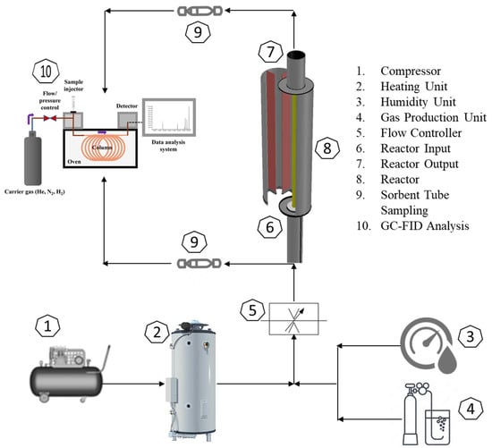 After the reactor is heated and humidified, a predetermined amount of gas is introduced and then exits the reactor in a continuous flow to conduct the experiment. The volume and flow rate of the reactor were used to calculate the gas’s residence period. Figure 2 is a schematic representation of the experimental setup developed for this work. It was agreed upon that the best location for the reactor’s light source would be smack dab in the center of the cylinder’s diameter. Within the reactor’s interior, four photocatalyst plates were arranged vertically so that they faced each other at an angle of 90° and were the same length as the light source. Reactor diameters near 10 cm are typically selected in systems that employ reactors with circular geometries. Furthermore, it has been noted that typical reactor flow rates are under 3 L per minute [13,14,15,16]. Based on these data, the unique qualities of the privately developed reactor were identified. The reactor is constructed from stainless steel, and within it is a custom-made component designed to house the photocatalysts. The photocatalysts and the light source are separated by a 7 mm space inside the reactor. The reactor measures 45 cm in length and has an inner diameter of 14.5. The reactor’s input and exit ports are sealed with pipes and caps. It involves installing temperature sensors and a backup heater within the reactor to avoid heat loss, as well as placing wash bottles at the ends of the pipes leading to the reactor’s inlets and exits so that samples may be taken. The photocatalytic oxidation elimination system takes in a mixture of air and gaseous benzene and toluene. An air compressor supplied the system with a flow rate of 1 L/min. A gas production apparatus was designed to convert the liquid ACS reagent (99.99% purity from Merck) into the gaseous forms of benzene and toluene. Gas production was ensured in the wash bottle by adding air filtered through activated carbon at a rate of 35 mL/min using an air pump into a mixture of liquid benzene and toluene (2.5 mL). The produced gas is piped straight into the distribution network. An external gas flow controller was used to regulate the system’s gas flow. Through gas chromatographic analysis performed by the GC-FID machine, the gas input concentration was set to 14 mg/m3 for benzene and 0.4 mg/m3 for toluene.