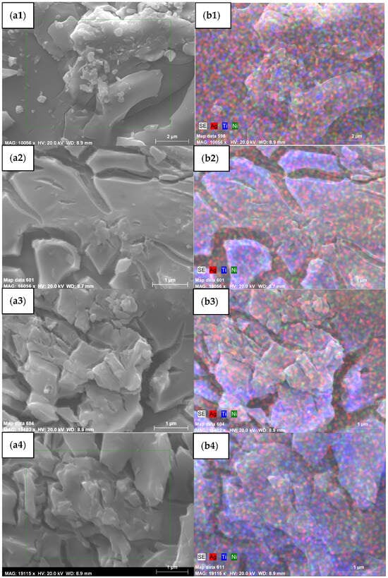 (a1) SEM image of 0.5% doped photocatalyst, (a2) SEM image of 1% doped photocatalyst, (a3) SEM image of 2.5% doped photocatalyst, (a4) SEM image of 5% doped photocatalyst, (b1) EDX mapping of Ag, Ni, and Ti element distribution of 0.5% doped photocatalyst, (b2) EDX mapping of Ag, Ni, and Ti element distribution of 1% doped photocatalyst, (b3) EDX mapping of Ag, Ni, and Ti element distribution of 2.5% doped photocatalyst, (b4) EDX mapping of Ag, Ni, and Ti element distribution of 5% doped photocatalyst.