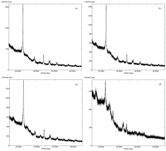 (a) XRD diffraction graphs of a 0.5% doped photocatalyst (Photocatalyst 1), (b) XRD diffraction graphs of a 1% doped photocatalyst (Photocatalyst 2), (c) XRD diffraction graphs of a 2.5% doped photocatalyst (Photocatalyst 3), (d) XRD diffraction graphs of a 5% doped photocatalyst (Photocatalyst 4).