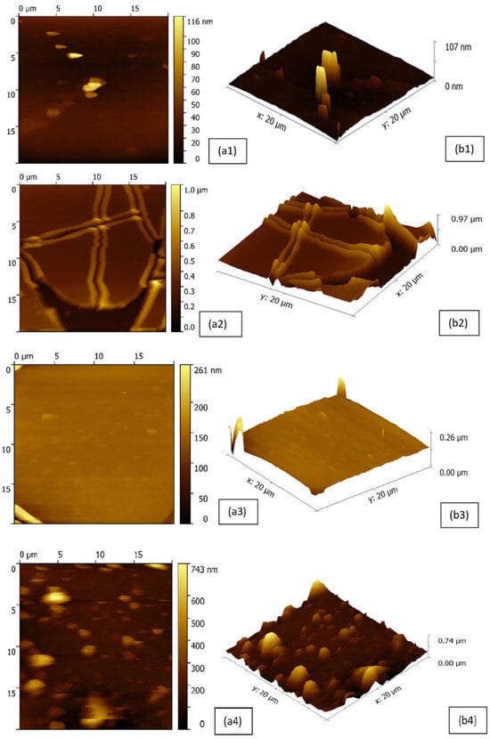 (a1) 2D AFM image of 0.5% doped photocatalyst, (a2) 2D AFM image of 1% doped photocatalyst, (a3) 2D AFM image of 2.5% doped photocatalyst, (a4) 2D AFM image of 5% doped photocatalyst, (b1) 3D AFM image of 0.5% doped photocatalyst, (b2) 3D AFM image of 1% doped photocatalyst, (b3) 3D AFM image of 2.5% doped photocatalyst, (b4) 3D AFM image of 5% doped photocatalyst.