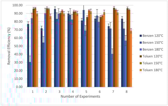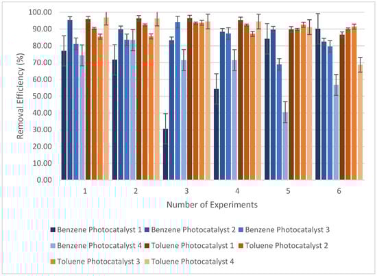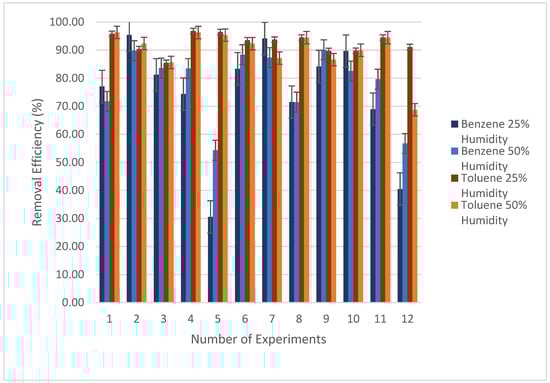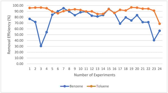 The findings of the experiments that were carried out as part of this research revealed that the average removal efficiency for benzene was found to be 76.24%, while the average removal efficiency for toluene was found to be 91.10% when exposed to the UVA light source. In Figure 6, a comparison is made between the percentage removal efficiencies of benzene and toluene regarding the number of experiments conducted. It can be deduced from this figure that the removal effectiveness of benzene has decreased in some experiments, which is the opposite of what happened with the toluene example. The entrance concentrations of contaminants may be the primary cause of these decreases. A higher entry concentration for benzene was given to the system because toluene is more likely to create by-products during photocatalytic oxidation and contaminate the surface of the photocatalyst [23,24]. Because of this, it was preferable to have low concentrations of toluene at the entry. Using the information that was gathered as a consequence of this research, an analysis was made to determine how the modifications that were made to the experimental conditions affected the removal efficiency.