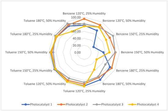 Using a UVA light source, the effects of doping on benzene and toluene removal efficiency at varied temperatures and humidity rates were examined. Figure 10 depicts the radar graph resulting from this scenario. In trials utilizing photocatalyst 2 under UVA light, benzene removal efficiencies were found to be higher than in the other trials under different conditions, as depicted in this graph. Moreover, experiments using photocatalyst 1 and photocatalyst 4 demonstrate a reduced removal efficiency for benzene pollutants at various conditions. For photocatalyst 1, this behavior was found unexpectable.