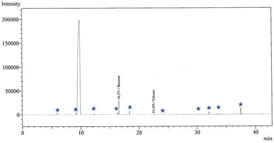 During this research, the GC-FID chromatograms revealed the presence of several undesirable peaks. An example chromatogram that was obtained from the analysis of the output sample can be found in Figure 11. This chromatogram represents the outcome of the experiment that was carried out at a temperature of 180 °C and humidity of 50%. It can be noticed in this figure that multiple peaks were not predicted (blue stars show these peaks). Comparable peaks were seen on a few of the other chromatograms of the output samples as well. These peaks were significantly more noticeable in the studies that were carried out under circumstances of 180 °C and 50% humidity. The presence of reaction intermediates may be demonstrated by the fact that these peaks dominate at higher temperatures. When Figure 11 is examined, it is seen that these unwanted peaks may be originated from compounds such as 1,2-dichloropropane, 1,1,2-tetrachloroethane, 1,3,5-trimethylbenzene, 1,1,2-trichloroethane, 1,2-dichlorobenzene, vinyl chloride, chloromethane, chloroethane and benzene-6d by comparing it with the chromatogram graph created according to the use of RTX-624 column for the contaminants that are commonly examined in VOC measurements with the Restek Pro EZGC Chromatogram Modeler [33].