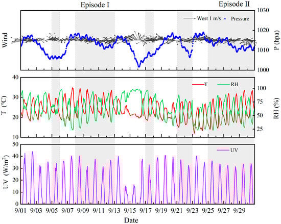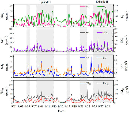 Based on the above definition, combined with the monitoring data from the state-controlled stations in Dongying, there were 15 polluted days and 15 clean days in Dongying in September 2022. Additionally, it can be seen that there were two long pollution periods. Episode I was from 8 to 12 September, dominated by light pollution. Episode II was from 25 to 30 September, dominated by moderate pollution. During the pollution period, the primary pollutant was O3 (the value of maximum daily 8 h average ozone (MDA8-O3) > 160 μg/m3), with high concentration of PM2.5 (>35 μg/m3), and the concentrations of other pollutants were also at high levels. It was obviously characterized by complex air pollution.
