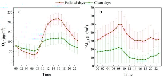 Diurnal variation of the O3 (a) and PM2.5 (b) concentrations on the polluted and clean days in Dongying in September 2022.
