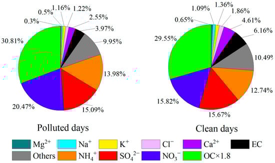 On polluted days, the proportions of PM2.5 components in decreasing order were organic matter (30.81%), NO3− (20.47%), SO42− (15.09%), NH4+ (13.98%), others (9.95%), EC (3.97%), Ca2+ (2.55%), Cl− (1.22%), K+ (1.16%), Na+ (0.50%), and Mg2+ (0.30%) (Figure 6). On clean days, the proportions of PM2.5 components in decreasing order were organic matters (29.55%), SO42− (15.82%), NO3− (15.67%), NH4+ (12.74%), others (10.49%), EC (6.16%), Ca2+ (4.61%), Cl− (1.86%), K+ (1.36%), Na+ (1.09%), and Mg2+ (0.65%) (Figure 6). The level of NO3− on polluted days were higher than those on clean days, with a difference of about 5%. The proportions of organic matters and NH4+ were about 1% higher on polluted days than those on clean days. The level of EC and Ca2+ on clean days were higher than those on polluted days, with a difference of about 2%. The proportions of Cl−, K+, Na+, and Mg2+ on clean days were higher than those on polluted days.