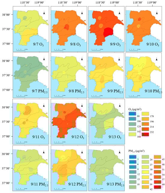 During episode I (Figure 7), the daily concentration of O3 in Dongying showed a distribution characteristic of “low in the north and high in the south” from 7 to 10 September. The O3 concentration increase began in the south of Dongying. With the development of O3 pollution, it reached more than 232 μg/m3 in the southern areas on 9 September, which was seriously polluted. On 10 September, the overall pollution situation improved, but it still exceeded 196 μg/m3 in most areas. On 11 September, the levels of O3 were 160–178 μg/m3 in all areas except in the north-central region, which were still 196 μg/m3. On 12 September, the O3 concentration rebounded, showing a distribution characteristic of “low in the north and high in the south”. On 13 September, it dropped to below 160 μg/m3, and O3 did not exceed the standard limit. Based on the distribution characteristics of PM2.5 concentration, the variation trend of PM2.5 concentration was consistent with that of O3 in Dongying from 7 to 13 September. The spatial variation of PM2.5 concentration was low on 7, 8, and 13 September, but high on 9, 10, 11, and 12 September. The concentration of PM2.5 on 9 September was high in the north and low in the south, while it was low in the north and high in the south on 10, 11, and 12 September. The overall concentration distribution characteristics were similar to those of O3.