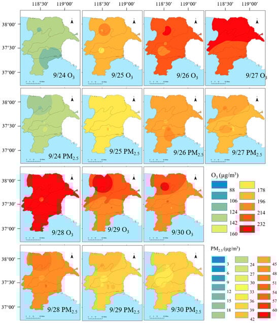 Spatial and temporal distribution of PM2.5 and O3 from 7 to 13 September 2022 and 24 to 30 September 2022.