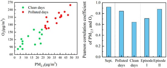 In September 2022, the Pearson correlation coefficient of O3 and PM2.5 was 0.92 in Dongying, showing a strong positive correlation (Figure 8). The Pearson correlation coefficient between O3 and PM2.5 was 0.84 and 0.64 on polluted and clean days, respectively. The positive correlation between O3 and PM2.5 was stronger on polluted days. In pollution days of episode I and II, the Pearson correlation coefficients of O3 and PM2.5 were 0.71 and 0.87, respectively. Compared with Episode I, which was dominated by light pollution, the correlation between O3 and PM2.5 was stronger in Episode II, which was dominated by moderate pollution, indicating that the correlation between O3 and PM2.5 was stronger with the increase in pollution level.