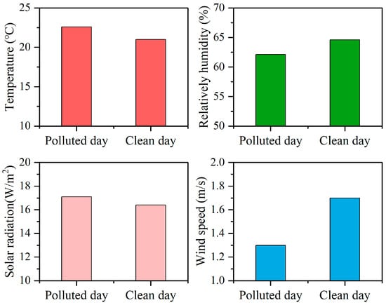 The daily average atmospheric pressure on polluted days (range: 1007.0–1018.0 hPa, mean: 1013.0 hPa) varied a little compared with that on clean days (range: 1004.7–1017.8 hPa, mean: 1013.5 hPa). Wind speed on polluted days (range: 0.7–2.3 m/s, mean: 1.3 m/s) was lower than that on clean days (range: 0.8–32.9 m/s, mean: 1.7 m/s). The dominant wind direction on polluted days was south wind, and the dominant wind direction on clean days was northeast wind. The diffusion conditions were poor at low wind speeds, and pollutants continued to accumulate locally. The daily average radiation flux on polluted days (UV-A: 14.4–19.3 W/m2, mean: 17.1 W/m2) was higher than that on clean days (UV-A: 6.9–22.7 W/m2, mean: 16.9 W/m2), and the high radiation flux was beneficial to the formation of O3.