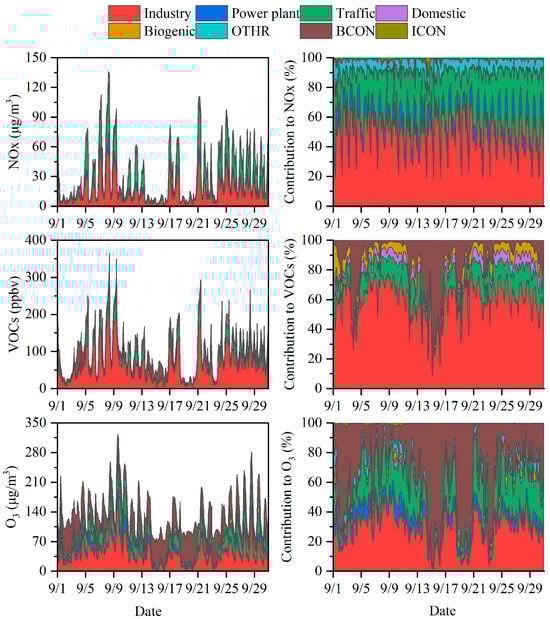 Model simulation results show that, in September 2022, O3 in Dongying mainly came from industrial sources (29% ± 12%) and transportation sources (18% ± 10%) (Figure 10). The precursor NOx was mainly from industrial sources (49% ± 12%) and transportation sources (29% ± 13%), and VOCs were mainly from industrial sources (59% ± 13%) and transportation sources (14% ± 7%) (Figure 10). During episode I, the industrial sources were the primary contributors of O3, NOx, and VOCs, with relative contributions of 36%, 48%, and 64%, respectively. Transportation sources were the second contributors to O3, NOx, and VOCs, with relative contributions of 23%, 29%, and 17%, respectively. Compared with the average values in September, the relative contribution of industrial sources to O3 and VOCs during Episode I increased by 5% and 7%, but decreased by 1% for NOx; the relative contribution of transportation sources to O3 and VOCs increased, and the relative contribution to NOx remained flat. During episode II, industrial and transportation sources were still the major contributors to O3, NOx, and VOCs in Dongying. Compared with the average values of Episode I, the relative contributions of industrial sources to O3, NOx, and VOCs decreased by 2–4%, while the contributions of transportation sources increased by 1–5%. It can be seen that the level of O3 and the precursors NOx and VOCs in Dongying is mainly influenced by industrial and transportation sources.