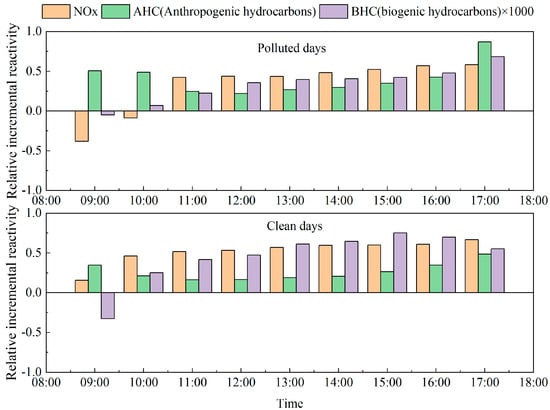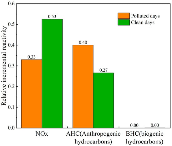 Relative incremental reactivity (RIR) is defined as the ratio of the percentage change in the net O3 formation rate (or amount) to the percentage change in the concentration (emission) of a particular species and is used to assess the impact of reduction of specific precursor on the net O3 formation rate (concentration). In this study, a sensitivity test was performed based on the assumption that each precursor class, such as NOx, anthropogenic hydrocarbons (AHCs), and biogenic hydrocarbons (BHCs), would be reduced by 20%. The equation for calculating the RIR is as follows: