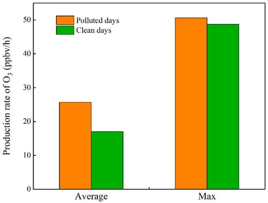 According to the simulated net formation rate of O3, the average net formation rate of O3 was 25.7 ppbv/h from 9:00 to 17:00 on polluted days, which was significantly higher than 17.0 ppbv/h on clean days (Figure 13). The maximum net formation rate of O3 on polluted days was 50.6 ppbv/h, which was slightly higher than that on clean days (48.7 ppbv/h). The local formation promoted the increase in O3 concentration on polluted days in Dongying.