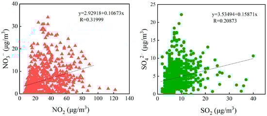 In September 2022, with the development of O3 pollution, the concentrations of NO3− and SO42− in PM2.5 increased to different degrees (Figure S6). From the hourly variations of SO2 and NO2 concentrations, the variation trend of SO42− concentration was relatively consistent with that of SO2 concentration, and the Pearson correlation coefficient was 0.21 (Figure 14). The variation trend of NO3− concentration was consistent with that of NO2, and the Pearson correlation coefficient was 0.32 (Figure 14). In general, with the concentration increases of precursors NO2 and SO2, the concentrations of NO3− and SO42− in PM2.5 increased significantly. The concentration increases of precursors NO2 and SO2 contributed greatly to the formation of NO3− and SO42− during the pollution period in Dongying.