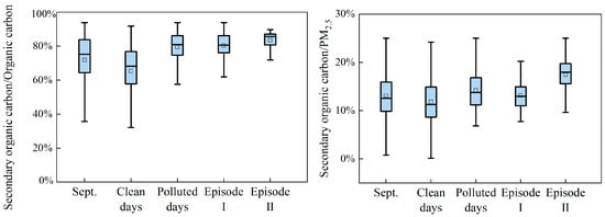 In September 2022, when the hourly concentration of PM2.5 increased, the concentrations of OC and SOC in Dongying increased significantly (Figure S7). The average SOC/OC was 71.8% ± 15.4%, with a range of 3.1% to 93.8% (Figure 15). The average proportion of SOC in PM2.5 was 13.1% ± 5.2%, with a range of 0.3% to 52.2% (Figure 15). Compared with clean days, the average proportion of SOC in OC and PM2.5 increased by 14% and 2.3%, respectively, on polluted days. During the two episodes, the proportion of SOC in OC and PM2.5 also increased; in particular, in episode II, which included four moderate pollution days, the proportion of SOC in PM2.5 increased by 5.5% compared with the clean day, indicating that SOC contributed significantly to PM2.5 on polluted days, especially on moderately polluted days.