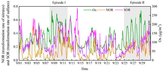 The variation trends of SOR and NOR were consistent with that of OX (Pearson correlation coefficients were 0.36 and 0.28, respectively) (Figure 16). In general, the variation relationship among OX, SOR and NOR reflected that the process of accelerated transformation of primary pollutants such as SO2 and NO2 was caused by strong atmospheric photochemical reactions. This process led to the conversion of precursors such as NO2 and SO2 to NO3− and SO42− in the O3 pollution process, which increased the concentration of secondary inorganic components in PM2.5. In the early stage of Episode I, Ox was at a high level, indicating that the overall atmospheric oxidation was enhanced, and SOR and NOR increased accordingly. During Episode II, the OX, SOR, and NOR all maintained high levels, indicating that the increase in OX atmospheric oxidation was an important reason for the increase in NO3− and SO42− concentrations in PM2.5.