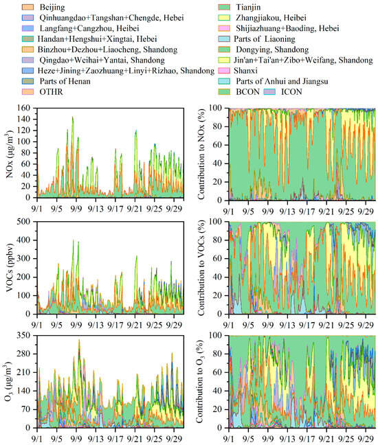 Absolute and relative contributions of each marked regions to the near-surface NOx, VOCs, and O3 at the Atmospheric Observatory of Dongying in September 2022. OTHR, BCON, and ICON denote contribution from other areas, boundary condition, and initial condition, respectively.