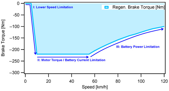 The distribution of regenerative and friction braking in regenerative-friction coordinated brake control generates the brake force required by the driver through coordination between regenerative braking, which is decelerated by the driving motor, and friction braking, which presses the brake pads against the disc rotating with the wheels. The distribution of regenerative and friction braking in regenerative-friction coordinated brake control generates the brake force required by the driver through coordination between regenerative braking, which is decelerated by the driving motor, and friction braking, which presses the brake pads against the disc rotating with the wheels. Ideal regenerative coordinated brake control aims to maximize the use of a regenerative brake; however, there are limitations in relation to the maximum torque the electric motor can deliver, the state of charge (SOC) of the battery, and the vehicle speed, as shown in Figure 1 and described below [20,21,22].