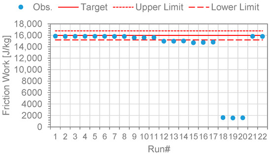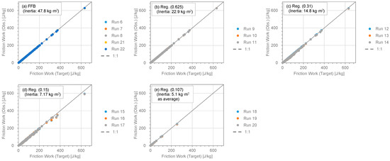 As a quality standard for the simulation of the friction work (J/kg) recovery on brake dynamometers, we plotted the friction work measured for brake events #1–303 against the target value in Figure 3. Both controls plot near a 1:1 straight line and reach the target friction work. The results show that the test brake in this study was able to very reproducibly control the friction work of the target under all conditions. The total friction work (J/kg) shown in Figure 4 was achieved with an FFE of 1% against the GTR24 target. Under regenerative brake conditions, the observed percentage was slightly lower than the target of 5%: 2% at Reg. (0.625), 6% at Reg. (0.31), and 7% at Reg. (0.15). The 6% and 7% of the target pattern below the lower limit were due to the ability associated with low inertia of the feedback control of the dynamometer rotation and brake torque. Reg. (107) differed from the braking time in the WLTP-brake profile because of the absorption of torque by regenerative braking (there was time without friction braking). The total frictional work (J/kg) of Reg. (107) was 90% lower than the WLTP-Brake profile of the GTR24.
