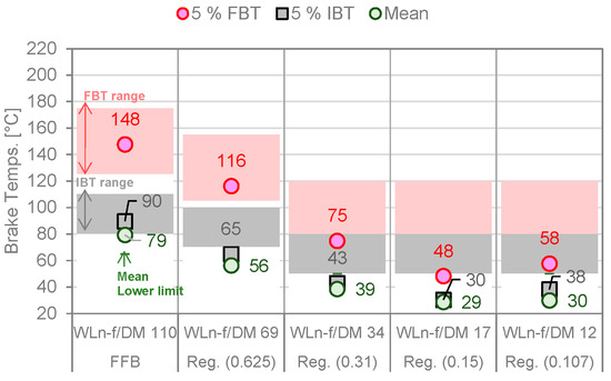 Disc brakes are used to decelerate a vehicle. The pads press against the disc to reduce its rotation. During this process, it is generally known that the friction brake applies a friction force to convert the kinetic energy of the vehicle into thermal energy, which then dissipates into the atmosphere. Because the kinetic energy applied to the friction brake (friction work) is correlated with the brake temperature, the friction work and brake temperature were strictly defined during the development of the GTR24. Furthermore, because brake wear particle emissions are sensitive to brake temperature in some brakes [23], a method has been proposed to adjust the rate of air flow to keep the brake temperature at the time of testing within a specified temperature range based on the brake temperature (disc temperature) calculated from actual measurements by the actual vehicle so that similar measurements can be obtained at different installations. In this study, the nominal front Wheel Load/Disc Mass (WLn-f/DM) ratio was 110 for FFB, the average Trip 10 temperature was 79 °C, the Averaged Initial Brake Temperature (IBT) was 90 °C, and the Averaged Final Brake Temperature (FBT) was 148 °C as shown in Figure 5. These temperatures were within the respective specified values (Trip 10 Average ≥65 °C, IBT 95 ± 25 °C, FBT 150 ± 35 °C). Reg. (0.625) assumes a regenerative-friction coordinated brake and therefore WL/DM 69, which is in the brake temperature range specified by WL/DM 65–85 of the FFB. Reg. (0.31) is WL/DM = 34, Reg. (0.15) is WL/DM = 17, and Reg. (0.107) is WL/DM = 12, all of which are below the brake temperature specified by WL/DM ≤ 45 of the FFB. Because there is no definition of the brake temperature for small vehicles with WL/DM ≤ 45 in the GTR24, the rate of air flow of 4.1 m3/min (246 m3/h), the air flow rate set in this study, must be reduced to achieve a higher brake temperature.