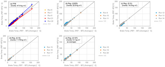 As a quality criterion for brake temperature reproducibility against brake work controlled by the brake dynamometer, Figure 6 plots the brake temperatures measured in brake events #1–303 against the average temperature for each condition. The temperature difference between peak braking (PBT) and initial braking (IBT) confirmed that the brake temperature increased with the energy given to the brake. The fact that both controls plotted around a 1:1 straight line indicated that the brake temperature was highly reproducible. In contrast to the very small variation in the Friction Work shown in Figure 3, a maximum difference of 35 °C was observed for the FFB shown in Figure 6. Even if friction work can be strictly controlled, this study showed that it is difficult to strictly reduce the variation in brake temperature.