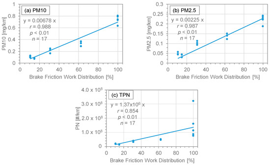Based on the GTR at the time of this experiment, we calculated the brake wear particle emission factor for electrified vehicles from the emission factor of FFB vehicles using the so-called friction brake share coefficients [11]. A coefficient of 0.63 is specified for hybrid electric vehicles (HEVs, NOVC-HEV Cat. 1), 0.3 for plug-in hybrid electric vehicles (PHEVs, OVC-HEV), and 0.15 for fully electrified vehicles (PEV). Scatter plots of the PM10, PM2.5, and TPN emission factors versus the distribution of brake friction work, measured for each regenerative braking condition in this experiment, are shown in Figure 7. In this experiment, although there was little variation in the frictional work (Figure 3) and brake temperature (Figure 6) measured for each distribution of brake friction work, there was a linear correlation for PM10 and PM2.5 and a curvilinear correlation for PN. For PM10, the brake wear particle emission factor for electrified vehicles according to GTR, calculated from the emission factor for FFB vehicles using the friction brake sharing coefficient, seemed to provide reasonable results. However, in the FFB conditions of the TPN, there was much variation because of the unstable condition of the pad surfaces of the electric vehicle brakes (which were not designed for high braking temperatures) measured under FFB conditions or because of insufficient bedding, which resulted in unstable measurements.