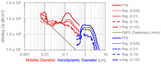 Figure 9 and Figure A3 show the average distribution of nanoparticle sizes for brake events as a function of their mobility particle diameter (particle size range 0.006–0.5 μm) and coarse particles as a function of their aerodynamic particle diameter (particle size range 0.3 to 20 μm). The mode diameter was ~120 nm for the mobility particle diameter and 1–2 μm for the aerodynamic particle diameter, regardless of the test conditions. It is apparent that the brake-wear particles contained fine particles. In general, detectors that sense charged particles based on the values of electrical currents are called electrometers in FMPS and other instruments, and they are generally known to be quantitative when they detect concentrations of 103 #/cm3 or higher. If the particle size is above the line of the minimum signal value that the FMPS 3091 instrument is capable of detecting, then the particle is considered to be detected. For the FFB condition in Figure A3, nuclei-mode particles with diameters of 20 nm or less were detected. Compared with regenerative-friction cooperative brake conditions (Figure A3), the smaller friction brake distribution tended to shift the particle concentration slightly toward smaller particle sizes, with fewer numbers of particles near 120 nm in the mobility particle size range. However, it was difficult to determine whether nuclei-mode particles were detected because of their low concentrations. To clarify the particle size distribution for emissions of brake-wear particles at low concentrations, continuous research on measurement methods is needed, such as comparative measurements using CPCs with different minimum measurable particle sizes (i.e., cut-off diameter) or direct measurements to verify the sample concentration.
