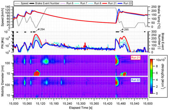 The total mass loss of the friction partners (pads and discs) was determined (unit: mg), and the wear factor divided by the total test mileage (unit: km) was derived to allow comparison with the airborne particle emission factors. Mass loss of the friction partner was measured before and after a test in the laboratory at a temperature of 20 °C and a relative humidity of 50%. We used an electronic balance for brake pads (XPR404SV, resolution 0.0001 g, Mettler-Toledo International Inc., Columbus, OH, USA) and mass comparator brake discs (XPR10003SC, resolution 0.001 g, Mettler-Toledo International Inc., Columbus, OH, USA), respectively. The mass loss measurement was only performed for the FFB tests of Runs #1–8 in Table A1, and measurements were taken within 1 h immediately after the test.