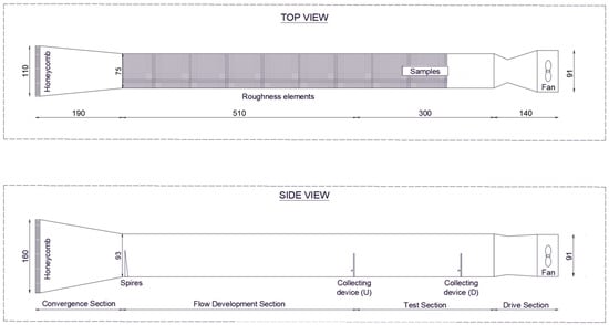 The validation, which was carried out via a comparison between the data measured in the tunnel and the target wind profiles, highlighted that the new wind tunnel accurately reproduces the desired ABL. It can therefore be used to produce a database that will allow for the development or integration of physical–mathematical models of the emission phenomenon. Those models will be validated thanks to the possibility of video-recording the particles’ motion by mean of high-speed cameras set outside the tunnel walls (Particle Image Velocimetry methods).