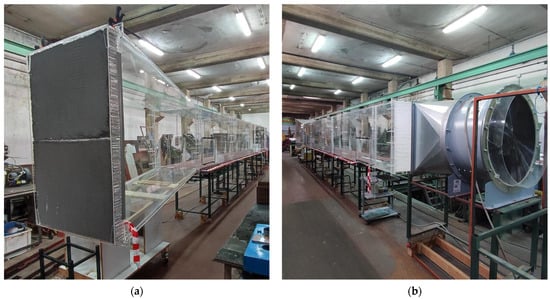 The Convergence Section (CS) promotes the acceleration and the alignment of the airflow and simultaneously reduces the air turbulence [,,,]. The ambient air enters the tunnel through a 1.60 m high and 1.10 m wide honeycomb flow straightener (i.e., a grid of small hexagonal cells). The honeycomb cells have a length-to-diameter ratio of 8, which effectively aligns the airflow parallel with the longitudinal axis of the tunnel [,].