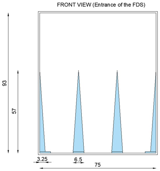 The project value δ was set at 0.45 m, about half the FDS height, according to Al Nehari []. The Hellman exponent (α) was set at 0.16, referring to the recommendation of the technical literature for open terrain [,]. The spires were designed according to Equations (2) and (3): 57 cm high and 6.5 cm wide spires were spaced at 25 cm (Figure 3). Downstream of the spires, the tunnel floor was covered with coarse-grit sandpaper (P20) to simulate the surface roughness of the erodible surfaces under study.