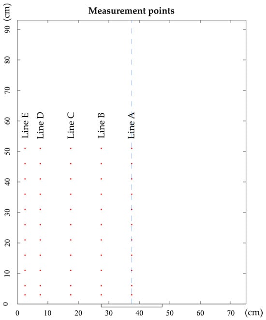 A series of wind velocity measurements were performed at the reference cross-section located at the entrance of the test section, aiming to verify the tunnel’s ability to replicate the required ABL. The wind velocity was measured at 55 points along five different vertical lines lying on the reference cross-section (Figure 4): line A (the symmetry vertical axis of the tunnel cross-section, 37.5 cm from the side walls), lines B, C, D and E (27.5 cm, 17.5 cm, 7.5 cm and 2.5 cm from the wind tunnel wall, respectively). The measurements covered only half of the cross-section, assuming the lateral flow symmetry.