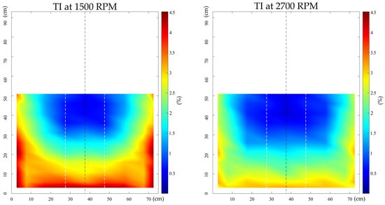 Turbulence intensity fields measured at fan operating speeds of 1500 and 2700 RPM.