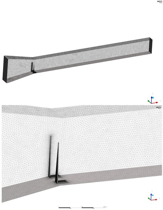 The CFD model of the EWT was developed using the ANSYS Fluent 2022 R2 software. The tunnel’s geometry and the mesh were created using the Ansys Design Modeler and the Ansys Meshing applications, respectively.
