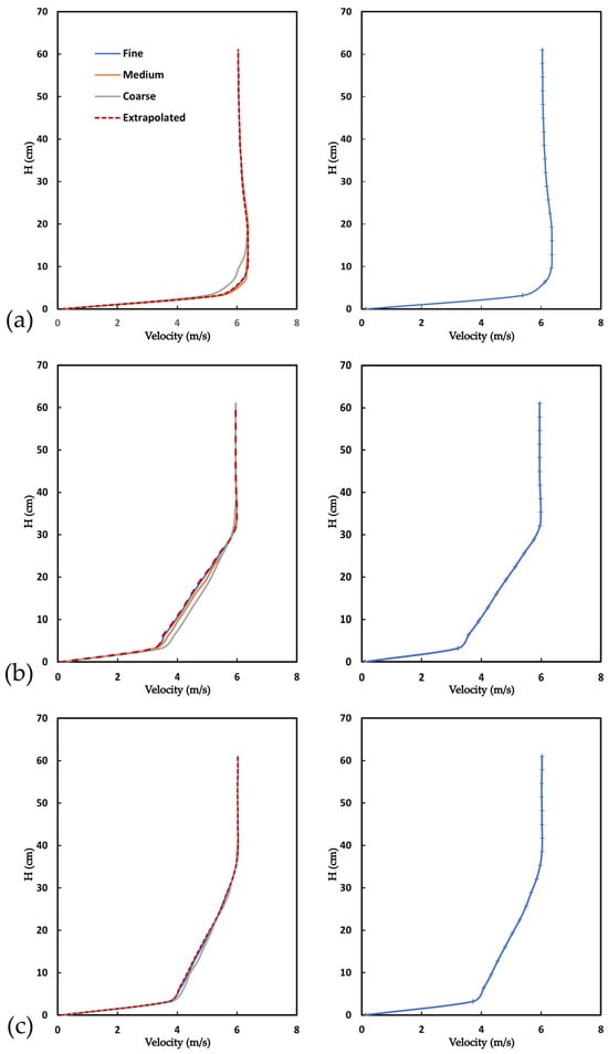 The average GCI values were 0.12%, 0.51%, and 0.26%, respectively, for the three positions (a, b, and c). These results indicate that the discretization error remains within the acceptable limits (<1%) so that the numerical solutions produced by the three grids were almost equivalent. The outcome is confirmed by Figure 10, which indicates that the wind profiles obtained with the three grids exhibit good relative agreement. Even though, when using the coarser grids, the results were quite satisfactory, the computational cost involved in adopting the fine grid was judged to be acceptable. Therefore, it was decided to adopt the fine grid in order to ensure that the best possible results were produced.