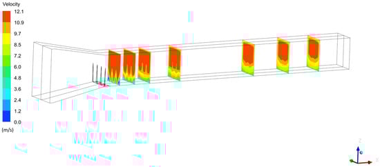 It is worth noting that, while the simulated boundary layer thickness (δ) closely matched that obtained through experimental measurements, there is an 18% disparity between the value derived from experimental tests and that obtained through CFD simulations for the parameter α. In its current state, in fact, the CFD model of the DICAAR EWT does not perfectly reproduce the experimental value of α, potentially due to minor inaccuracies in the boundary input conditions. Nevertheless, this difficulty is highlighted in similar studies published in the technical and scientific literature, which report significant differences between experimental and simulated α values [], while the evaluation of that coefficient is challenging even with in situ measurements []. Furthermore, the availability of the CFD model allows for an analysis of the wind field downstream the spires along the working section of the EWT, confirming that the length of the Flow Development Section (FDS) was correctly designed and the wind field is well-developed and uniform in the section designated for the emission tests. In addition, the CFD model allows for an investigation of the wind field near the roof, which was not characterized in the experimental test.