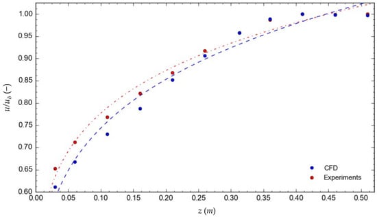 Fitting of the power law wind profile to the experimental data (red dots) and the CFD data (blue dots)—2700 RPM.