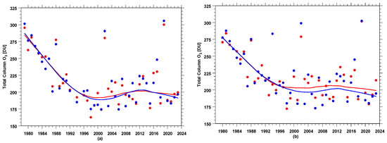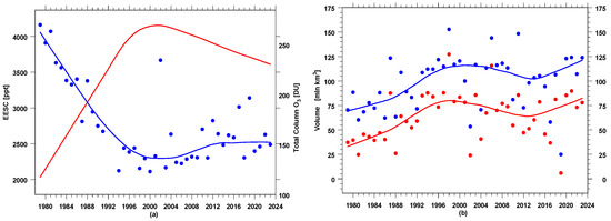 Annual time series for the period 1979–2023: (a) EESC (in red) and TCO3 at Halley Bay (averaged over the period 7 September–13 October, in blue); (b) PSC NAT volume (in blue) and PSC ICE volume (in red). The solid circles and the curve of the same color represent annual values and their smoothed course, respectively.