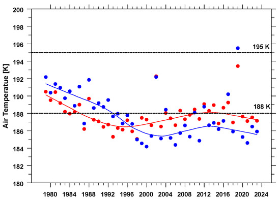 Temperature at 50 hPa (in blue) and 100 hPa (in red) averaged over the SH polar region (63°–90° S) for the period 7 September–13 October. The solid circles and the curve of the same color represent annual values and their smoothed course, respectively. Horizontal lines show the threshold temperatures for PSC emergence (195 K for PSC NAT and 188 K for PSC ICE).